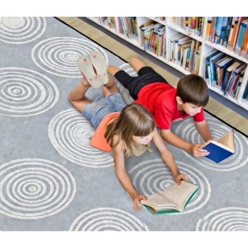 The Circles Grey & White Seating Circles Classroom Rug has a modern design used in classrooms, waiting areas, playrooms and bedrooms. The colors help it go well in any room. Offsets nice against wall décor that has a variety of tones. Use it for seating, lesson plans, and under furniture.