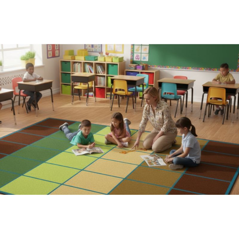 Nature-Inspired Design: Studies show that natural colors help reduce stress and encourage focus. The rug’s palette isn’t just attractive, it’s intentional. It brings the outdoors in, turning a busy classroom into a balanced space.
