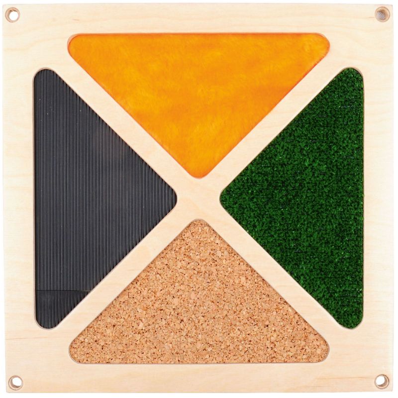 The panel is divided into four triangular sections, each with a distinct texture. The plush section is soft and yielding underhand. The ribbed surface offers a firm, defined tactile feel. The cork patch is natural and slightly rough. The grass-like zone is cool and irregular, mimicking outdoor ground cover. Children move from section to section freely, pressing, stroking, and comparing what each one feels like.