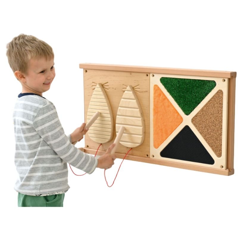 Tactile exploration is central to sensory integration therapy. Four distinct surface types on a single panel give practitioners a compact, wall-mounted resource for guided tactile work. It also serves as an effective self-directed activity between sessions in a therapy waiting area, giving children productive sensory input while they wait.