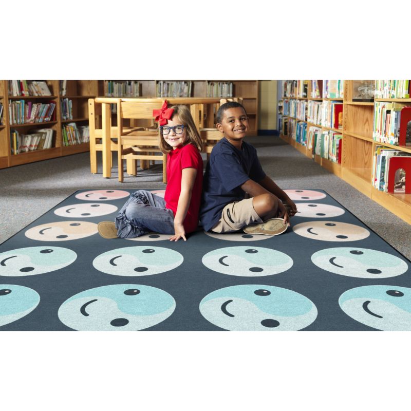 Each morning, little feet find their way to smiling pastel faces, each one a friendly reminder that this is their space. With clearly defined seating spots in soft shades of rose pink, peachy orange, mint green, and tranquil aqua, this rug creates a soothing atmosphere where young learners can thrive.