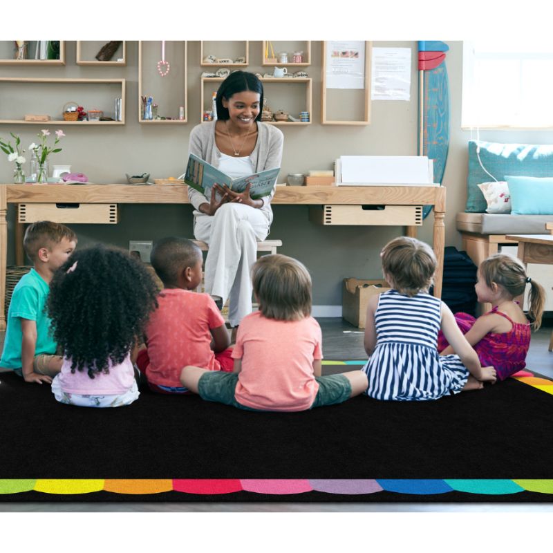 Border rugs work differently from seating rugs. Students sit along the colorful scalloped perimeter facing inward toward the center. The teacher works from the open black center - walking freely within the group, making eye contact with every child, and using the clear floor space for demonstrations, read-alouds, and shared activities.